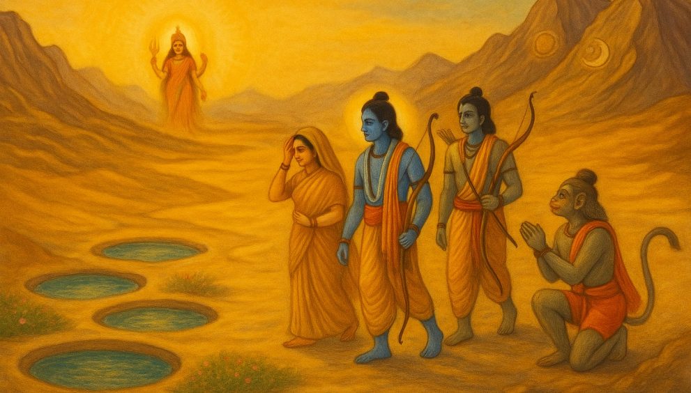 The blazing sun of the desert tested their resolve. When thirst struck, Hanuman and Lakshmana attempted to draw water with divine force—but failed.